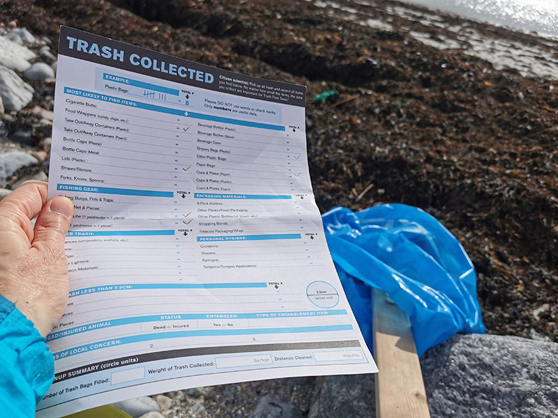I sit on a rock and listen to the roar of the Atlantic. The September sun illuminates the water and wet sand, reflecting the clouds. In the distance, the Mutton Island lighthouse gleams. On a special form, I check off the types of trash I find.