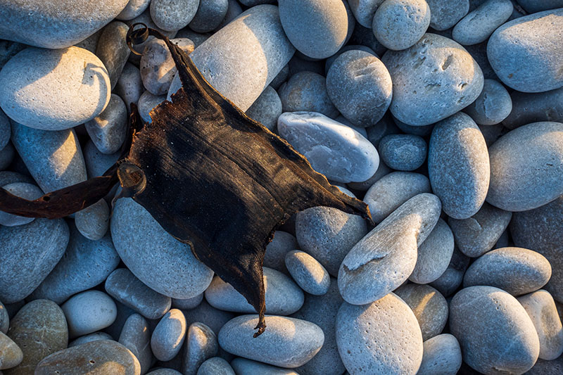 First, I try to balance on the rocks, then I sink calf-deep in brown seaweed. From beneath them, I pull out meters of rope and plastic, fishing nets. Some are buried so deep or crushed by the rocks that they’re impossible to move. Along the way, I find plastic yogurt containers, paper coffee cups, plastic candy bar wrappers, two large boards with nails, and a piece of fabric. My blue bag is really heavy.