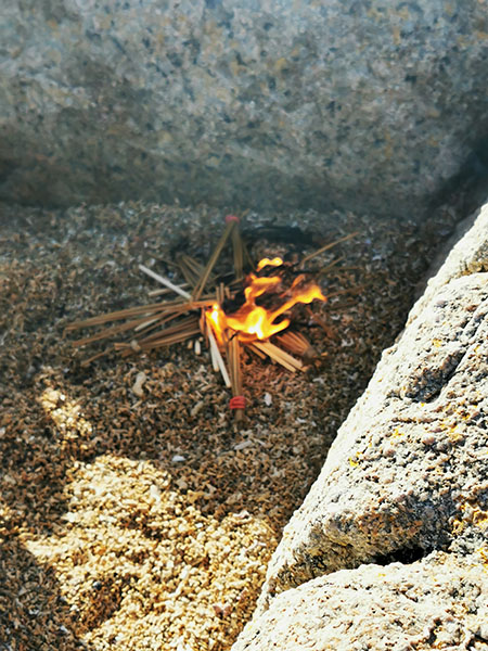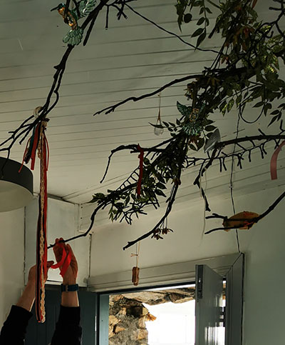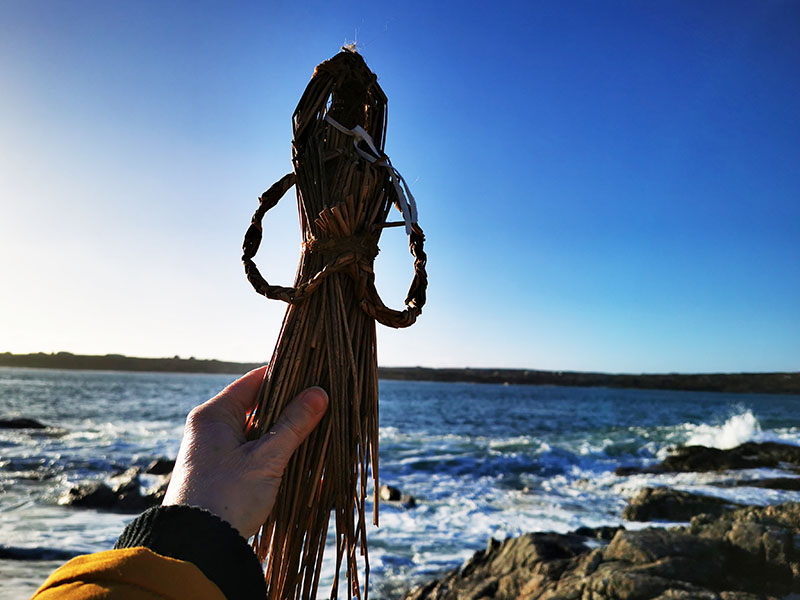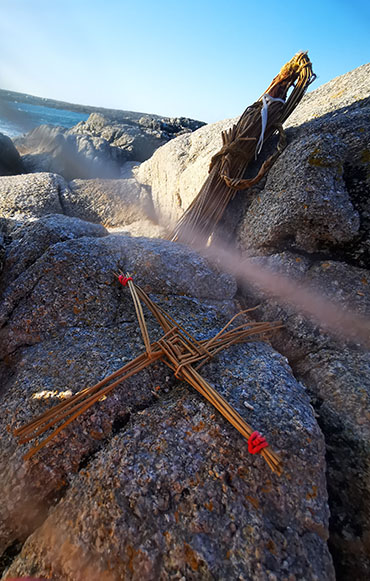 Zgodnie z irlandzką tradycją palimy zeszłoroczne krzyże z sitowia i czekamy jak ich prochy zabierze morze. Potem wieszamy kolorowe wstążki na gałęzi. Myśląc życzenia.
